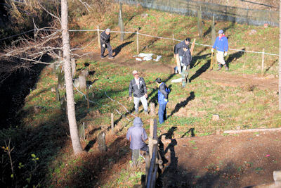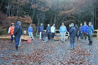 | 11月29日(日)、三年目に向けて始動。総勢50名の協力者が集まり、水源と導水管整備・遊歩道の整備と会場内整備(ロープ張り)の3班に分かれて作業を開始。手際もよく予定していた作業以上のエリアもできて無事この日は終了しまた。 |