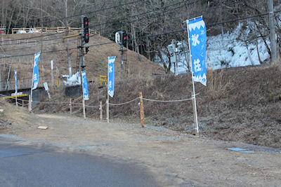 国道から林道入口にのぼりも設置され |