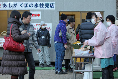 その後、氷柱会場にて、一番目の入場者に、町田観光協会長より地元産椎茸のプレゼント。また、横瀬町のゆるキャラ「ブコーさん」も会場に登場しイベントのお手伝い。当日は、メディアの取材もあり夕方NHKの首都圏ネットワークで放映されました。 |